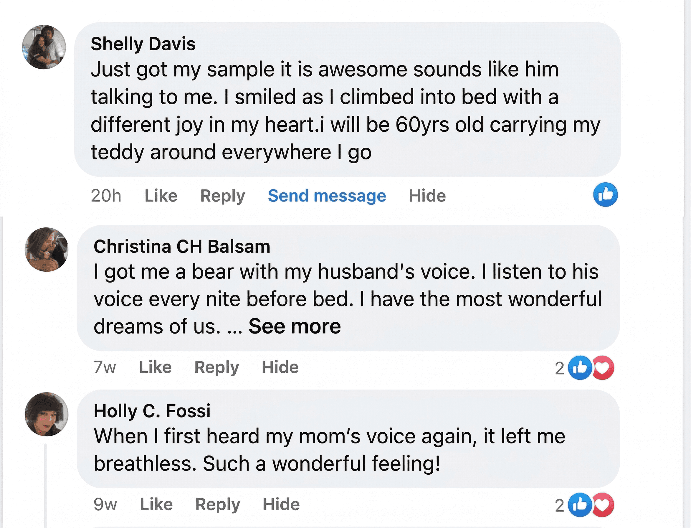 Not old recordings — we recreate their voice to say new things you needed to hear. Hug the bear. Hear them speak.
